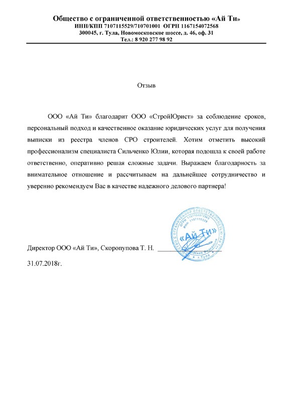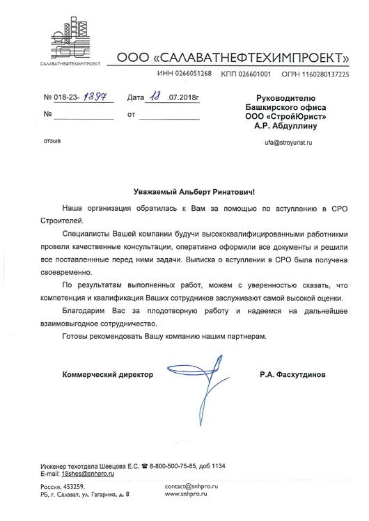 Отзывы клиентов "СтройЮрист" по вступлению в СРО в Нижневартовске